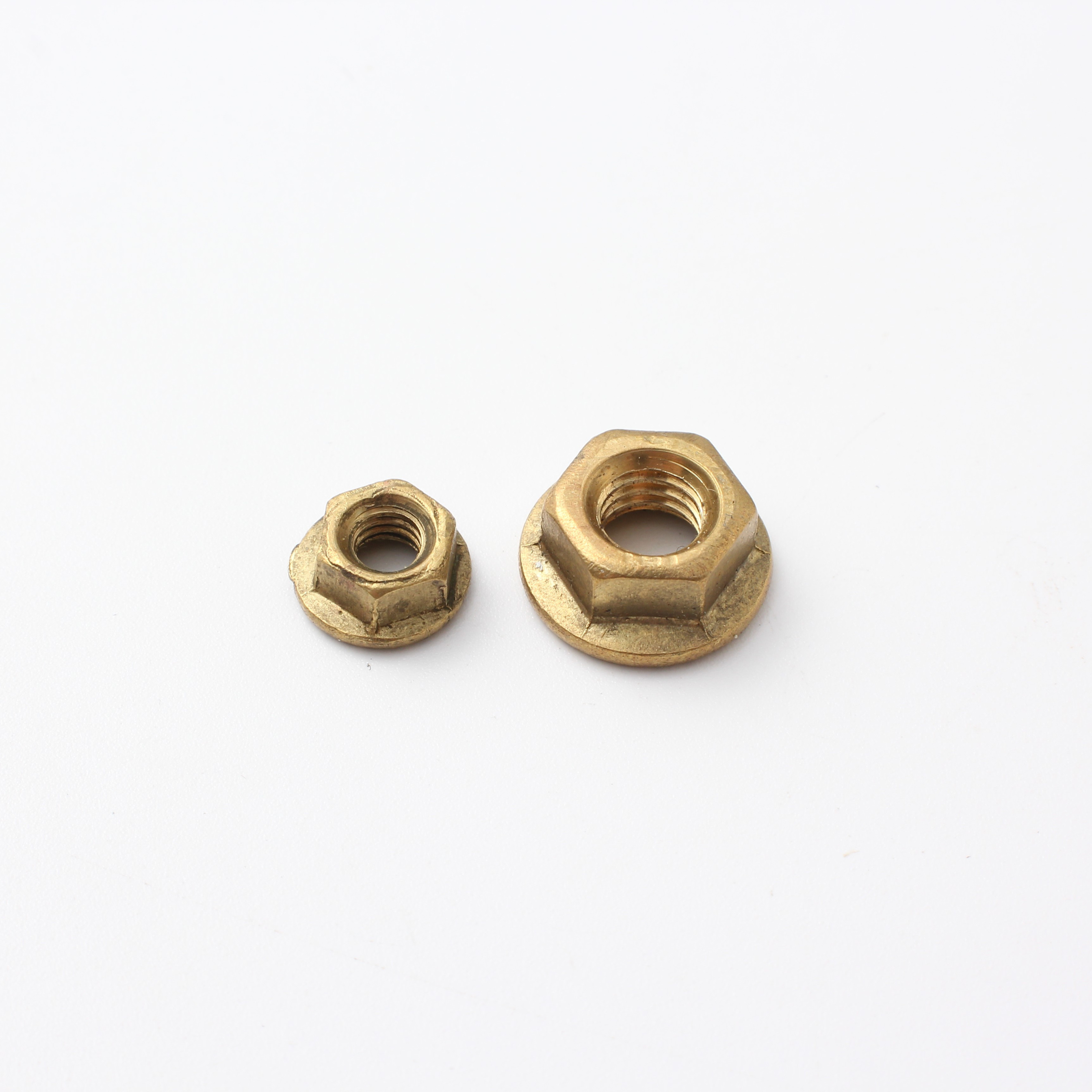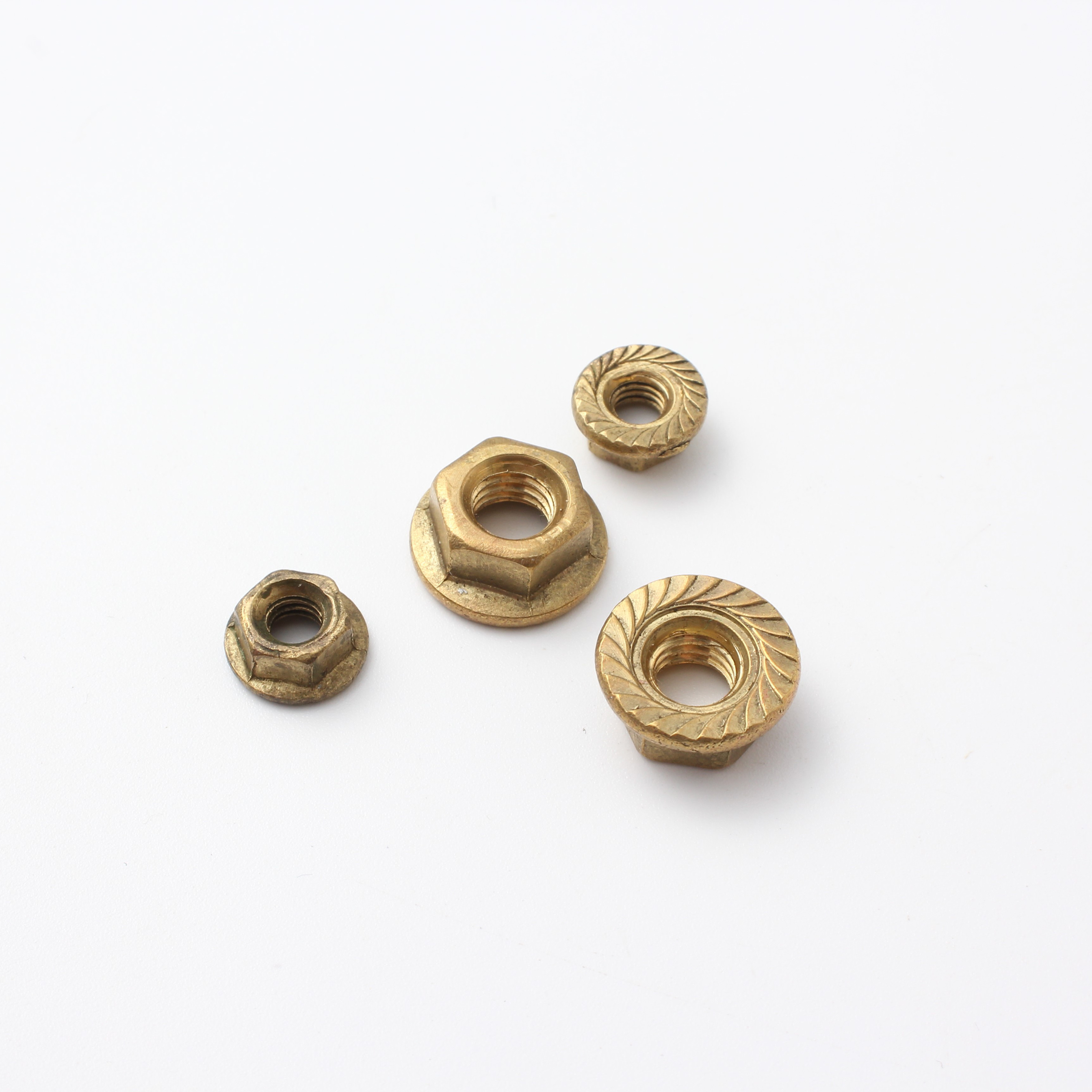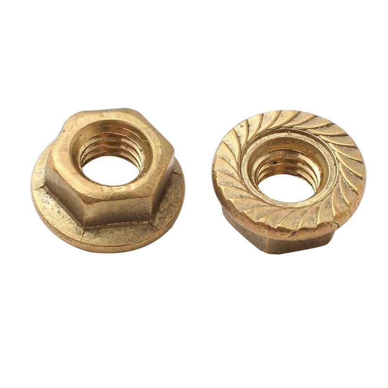 Шестигранная гайка с фланцем из меди и латуни DIN 6923 с болтом: это шестигранные гайки с фланцем, соответствующие стандарту DIN 6923, в комплекте с соответствующими болтами. Изготовленные из меди или латуни, они обладают превосходной коррозионной стойкостью, теплопроводностью и низким уровнем магнитных помех. Интегрированная конструкция фланца распределяет зажимное усилие по большей площади, уменьшая повреждение деталей и повышая устойчивость к ослаблению (трение фланца предотвращает ослабление, вызванное вибрацией, даже без зубцов).